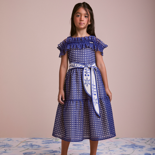 Vestido Infantil Festa Costas Trançadas e Flores Bordadas