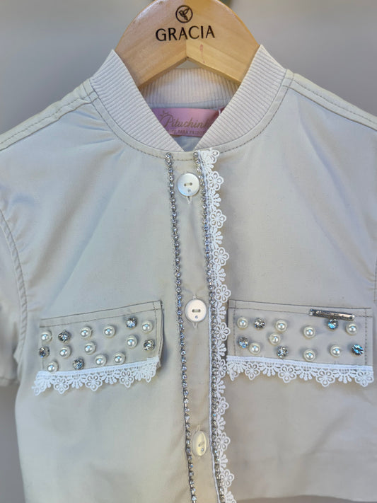Jaquetinha Manga Curta Infantil Bordados Pérolas e Cristais - Pituchinhus