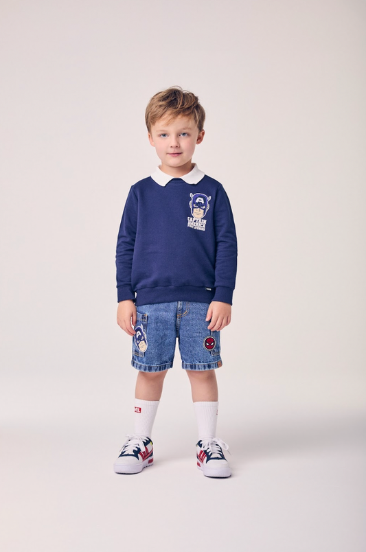 Conjunto Infantil Casaco Gola Polo e Bermuda Jeans Patchs Marvel - Youccie