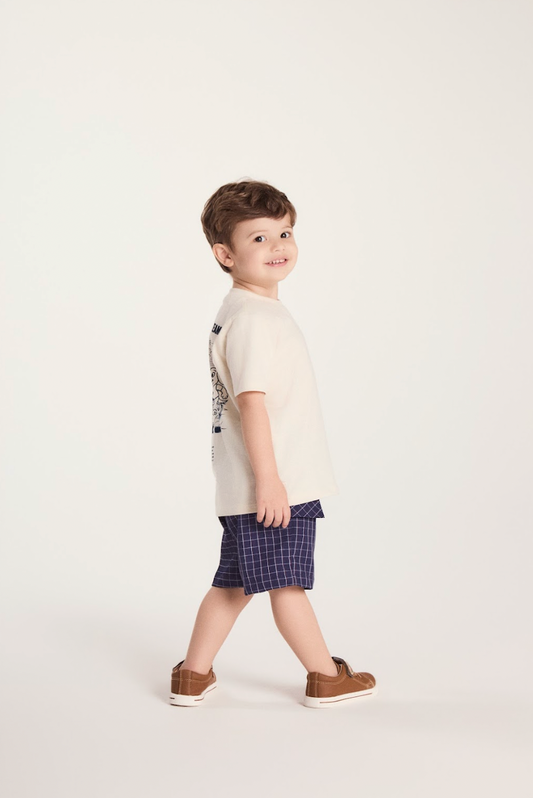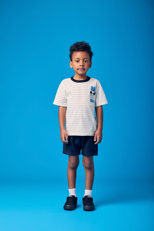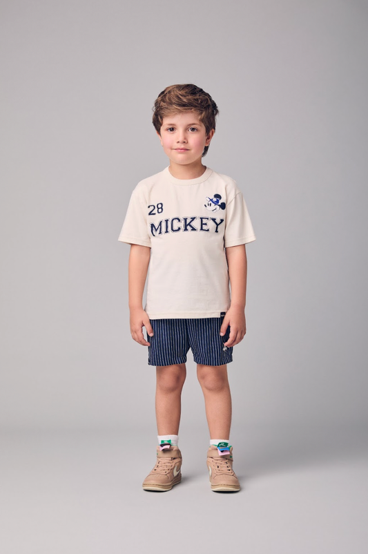 Conjunto Infantil Camiseta Bege Mickey e Bermuda Marinho Listrada - Youccie