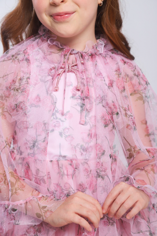 Vestido Infantil Festa Tule Rosa Flores - Petit Cherie