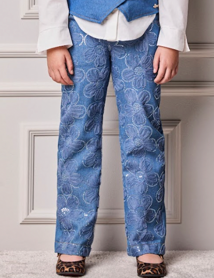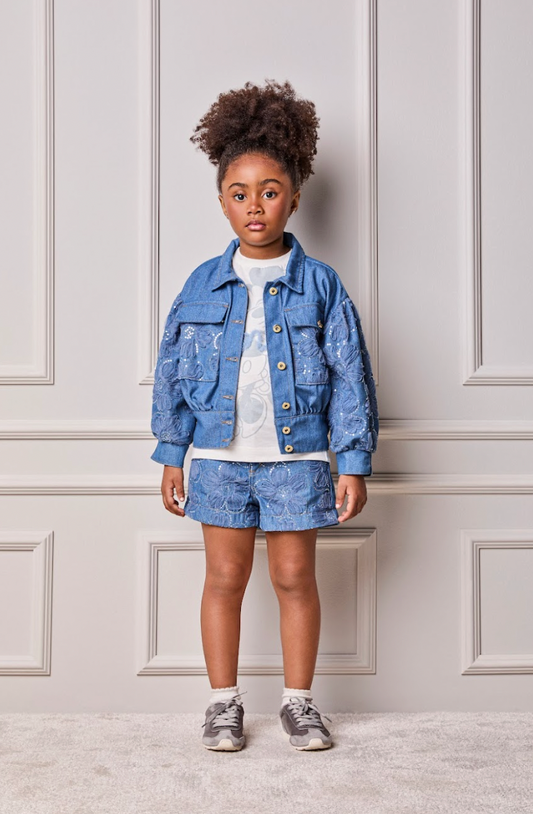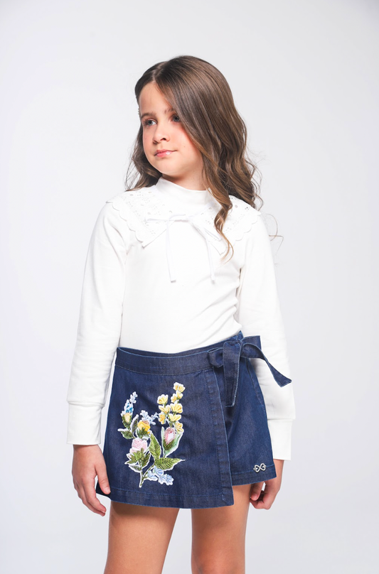 Conjunto Infantil Algodão Gola Bordada à Mão e Saia Jeans Balonê Bordada - Luluzinha