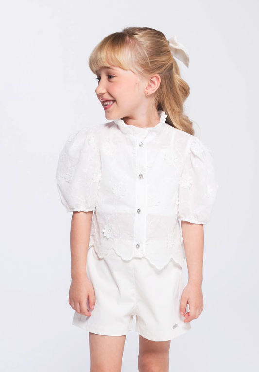 Conjunto Teen Top Cropped Babado Voil Bordado e Saia-shorts Voil Bordado - Two In