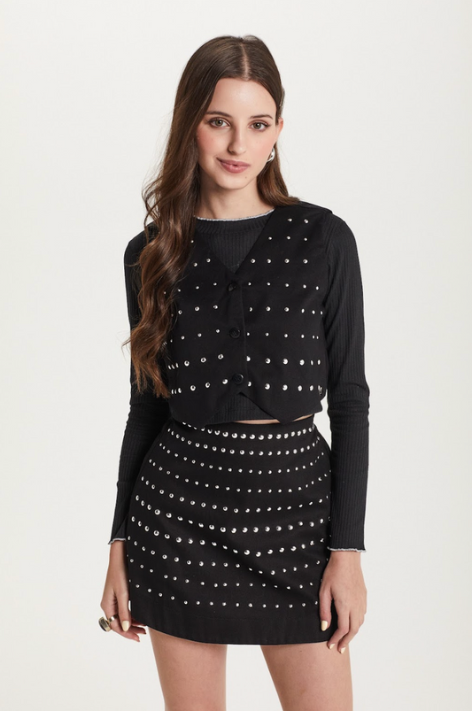 Conjunto Teen Blusa Canelada com Colete de Sarja Preto e Saia-Shorts Teen Sarja Strass Preto - Two In