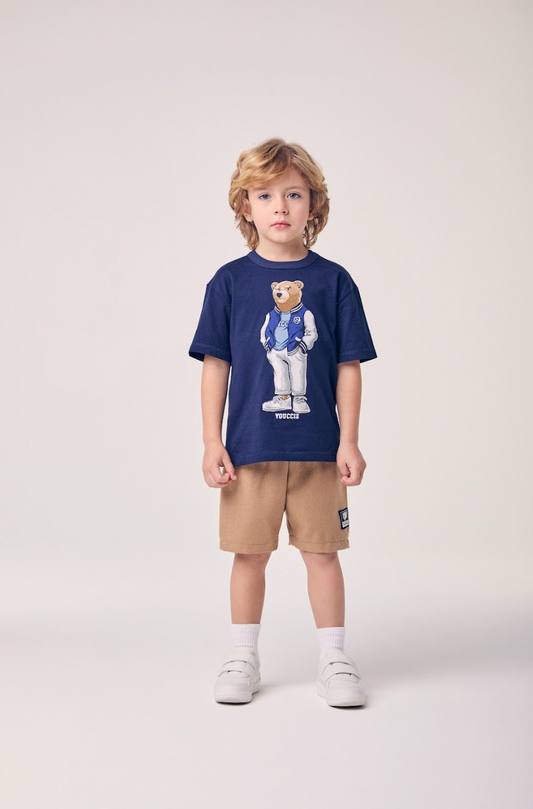 Conjunto Infantil Camiseta Ursinho College e Bermuda Bege - Youccie