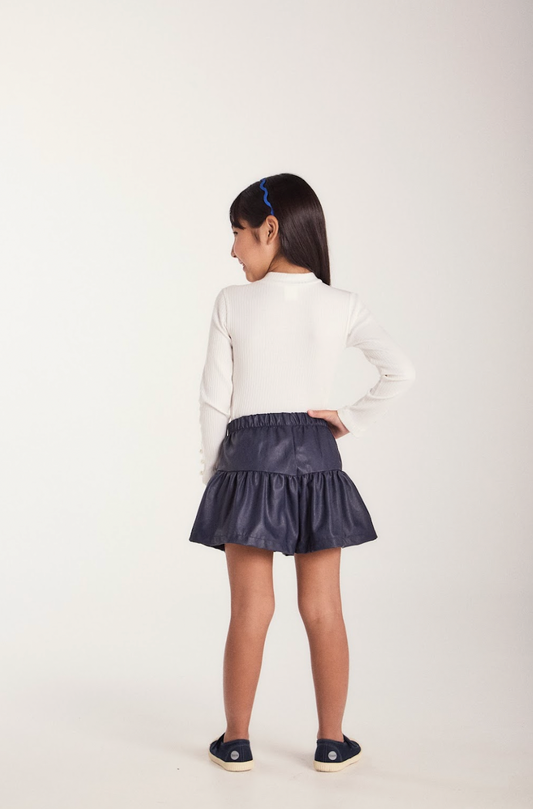 Conjunto Infantil Blusa ML Laço Bordado e Shorts Evasê Couro Tech Marinho - Beabá