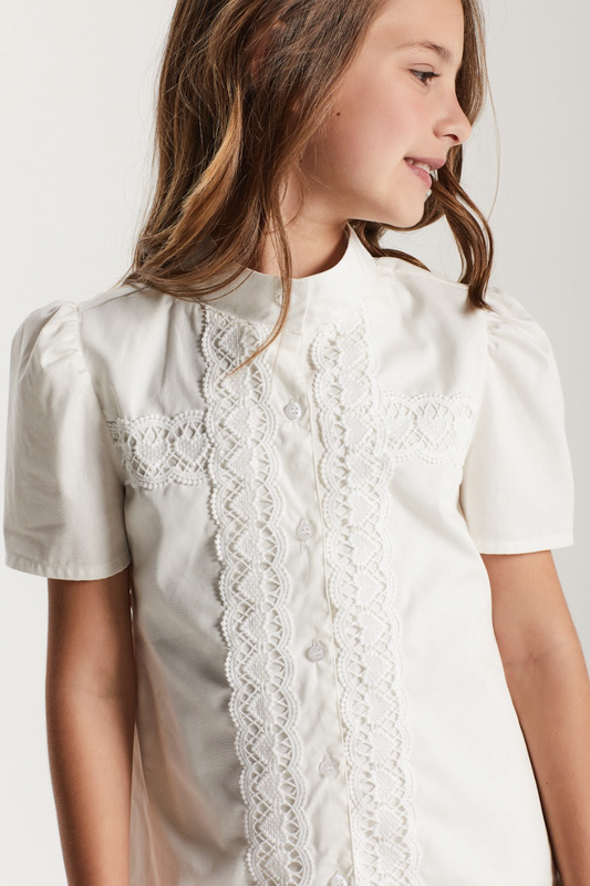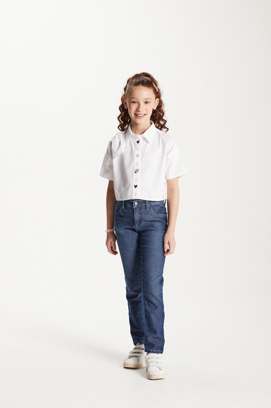 Camisa Infantil Cropped Tricoline Bordada Branca - Um Mais Um
