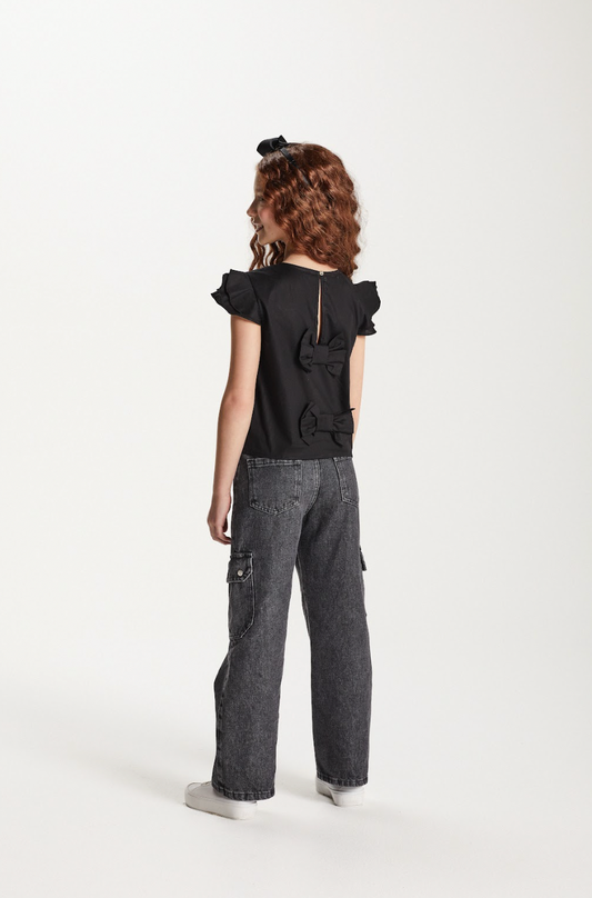 Camiseta Teen Baby Look Ursinho Amarração Mangas Preta - Two In