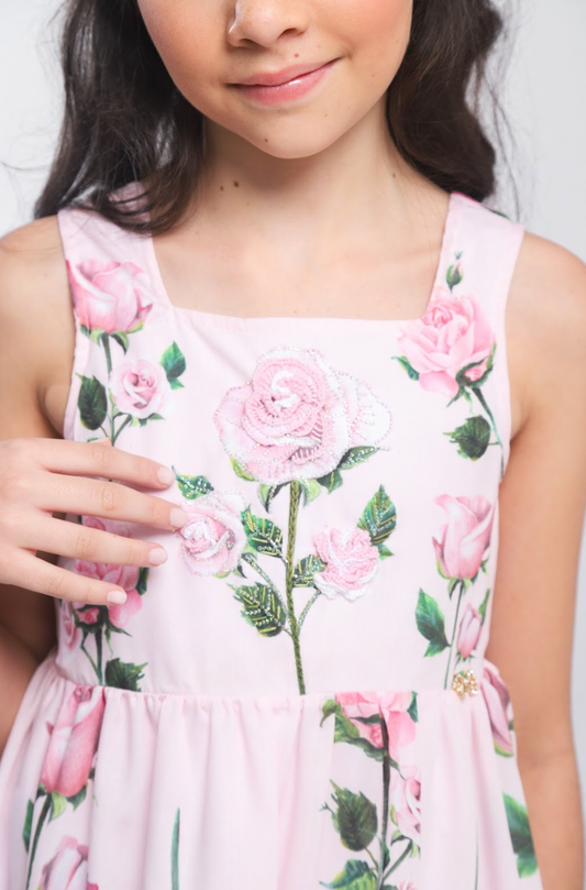 Vestido Infantil Festa Costas Trançadas e Flores Bordadas