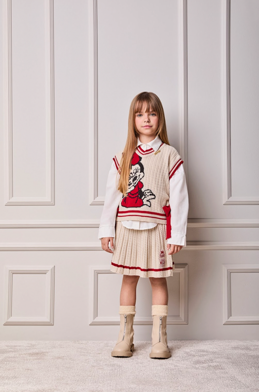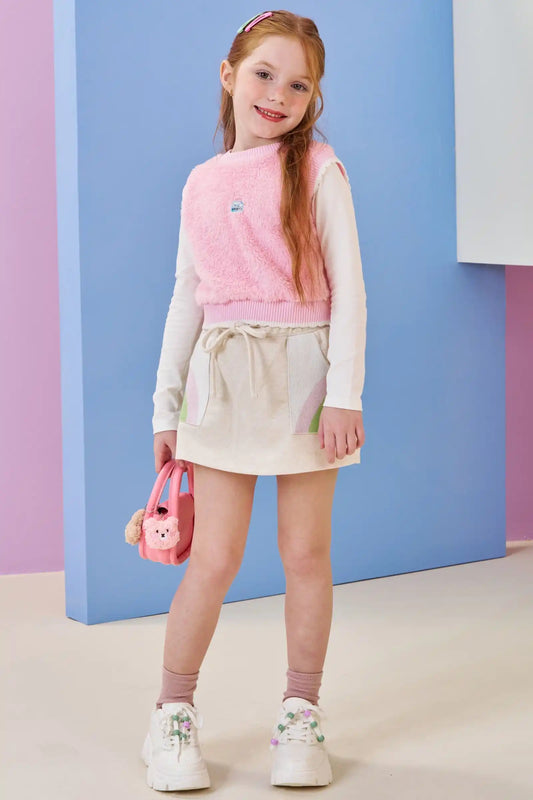 Conjunto Trio Blusa ML Off White, Colete Rosa e Saia Bege - Infanti