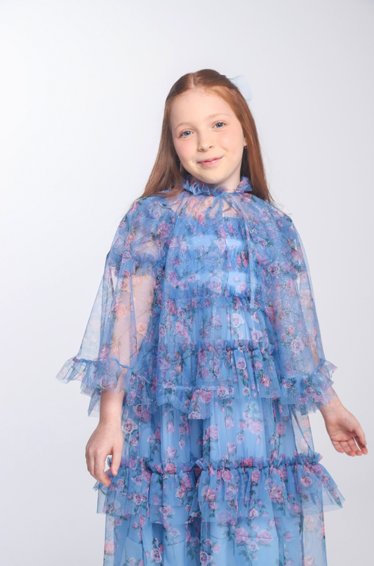 Vestido Infantil Festa Tule Azul Flores - Petit Cherie