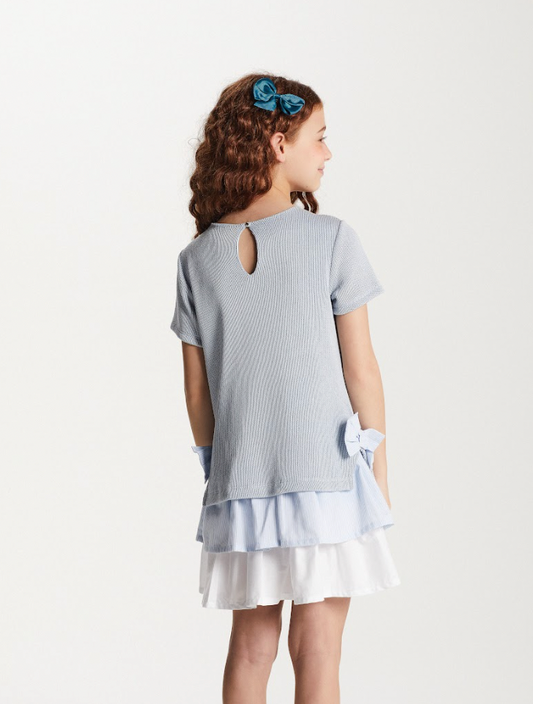 Vestido Infantil Jumper Tweed de Algodão Laço e Babado Azul - Beabá