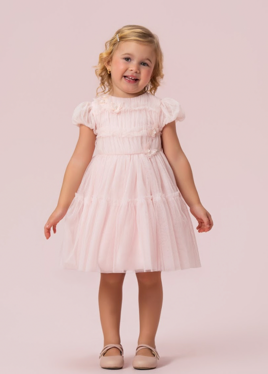 Vestido Infantil Tule Glitter Pregas e Laço Frontal Rosa Claro - Petit Cherie