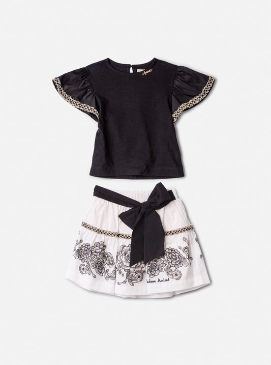 Conjunto Teen Blusa ML Tule Estrelas e Saia Sarja com Pregas Preta - Two In