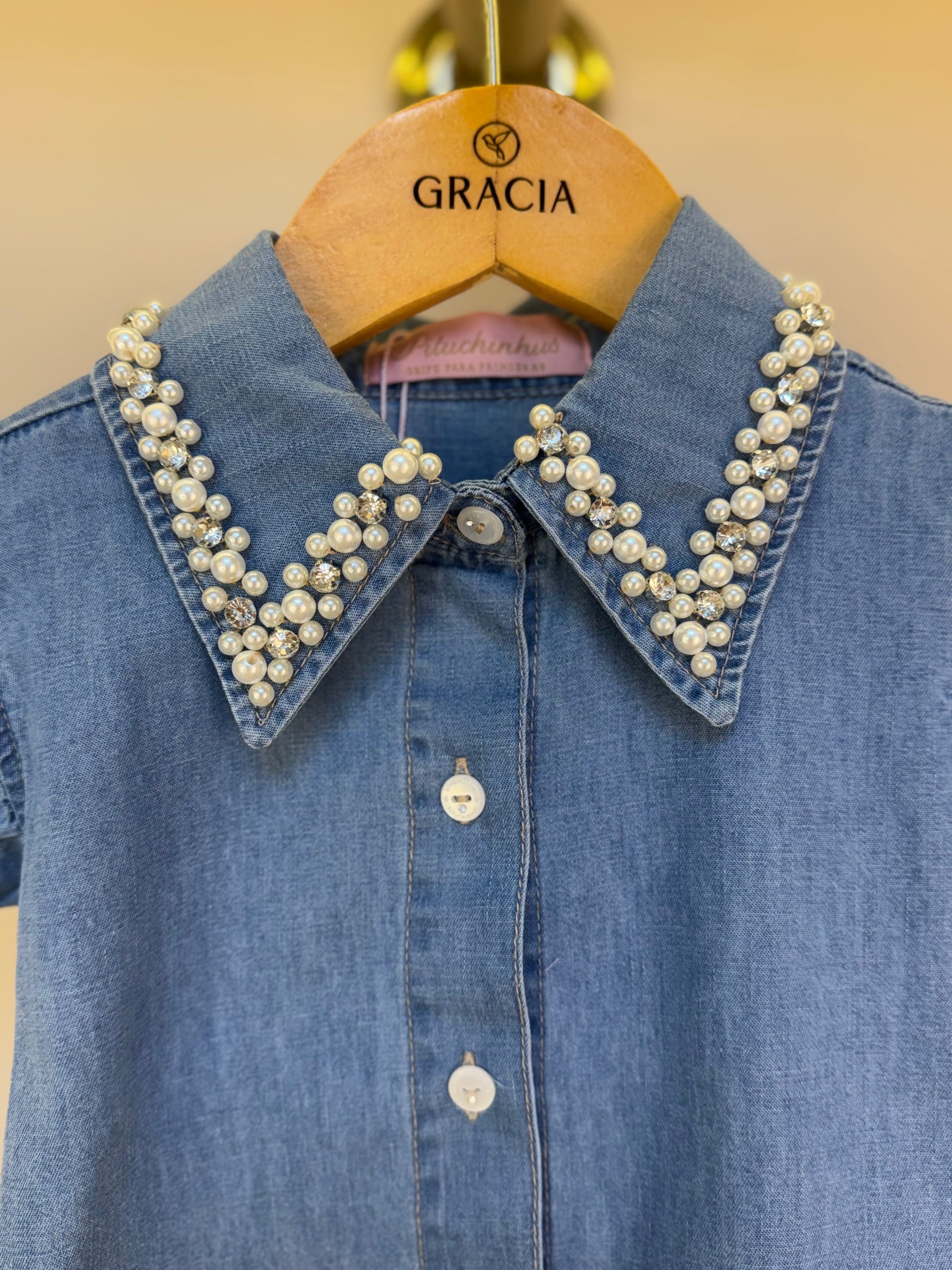 Camisa Infantil Jeans Gola Bordada Pérolas e Cristais - Pituchinhus