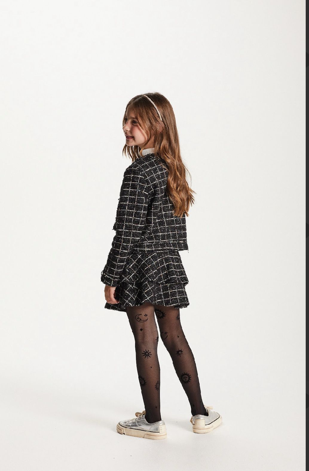 Conjunto Infantil Blusa Gola Babado com Casaco Tweed e Shorts Tweed Xadrez - Um Mais Um