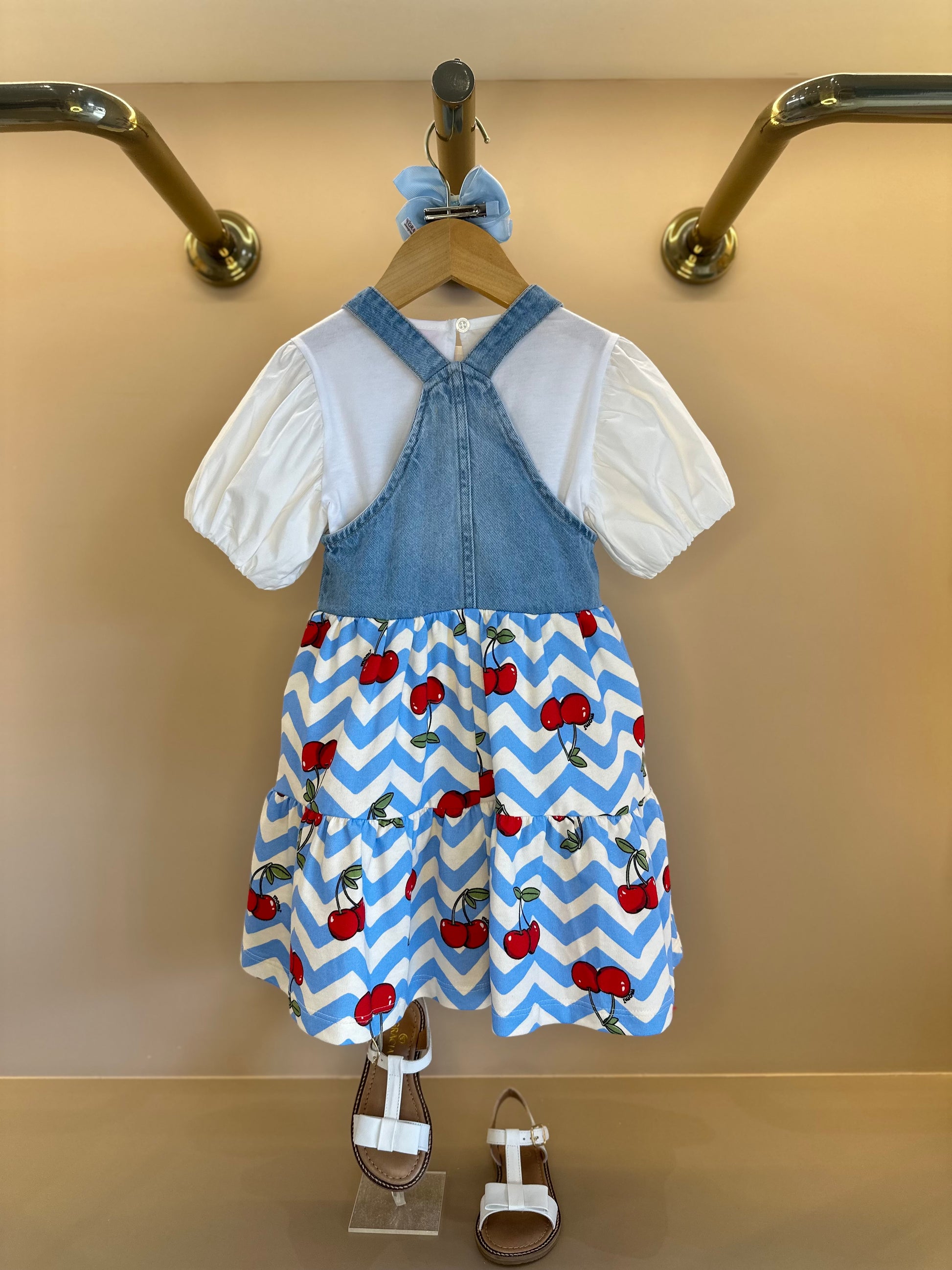 Conjunto Infantil Blusa Mangas Balonê e Salopete Cerejinha Jeans - Momi