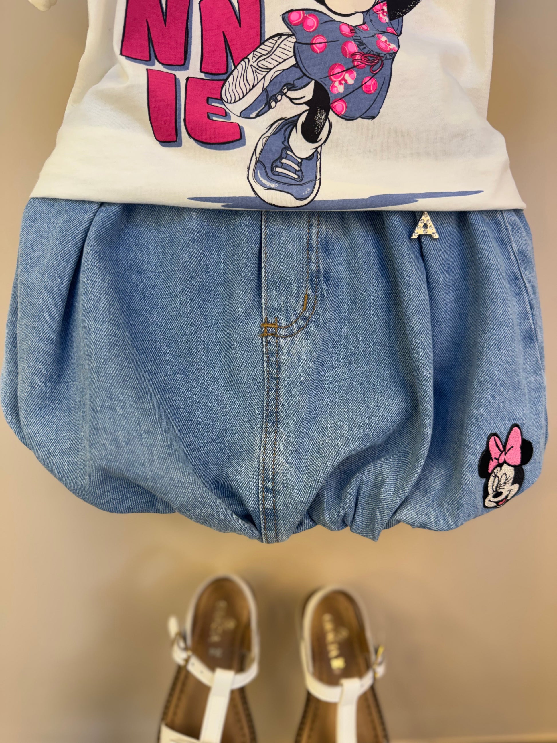 Conjunto infantil que combina estilo e conforto para as pequenas fãs de Minnie. A blusa tennista apresenta gola rosa e azul vibrantes, trazendo o charme clássico da personagem, enquanto a saia jeans com elástico oferece praticidade e liberdade de movimento. Perfeito para o dia a dia, este look anime-inspired garante uma criança elegante e à vontade em qualquer ocasião.