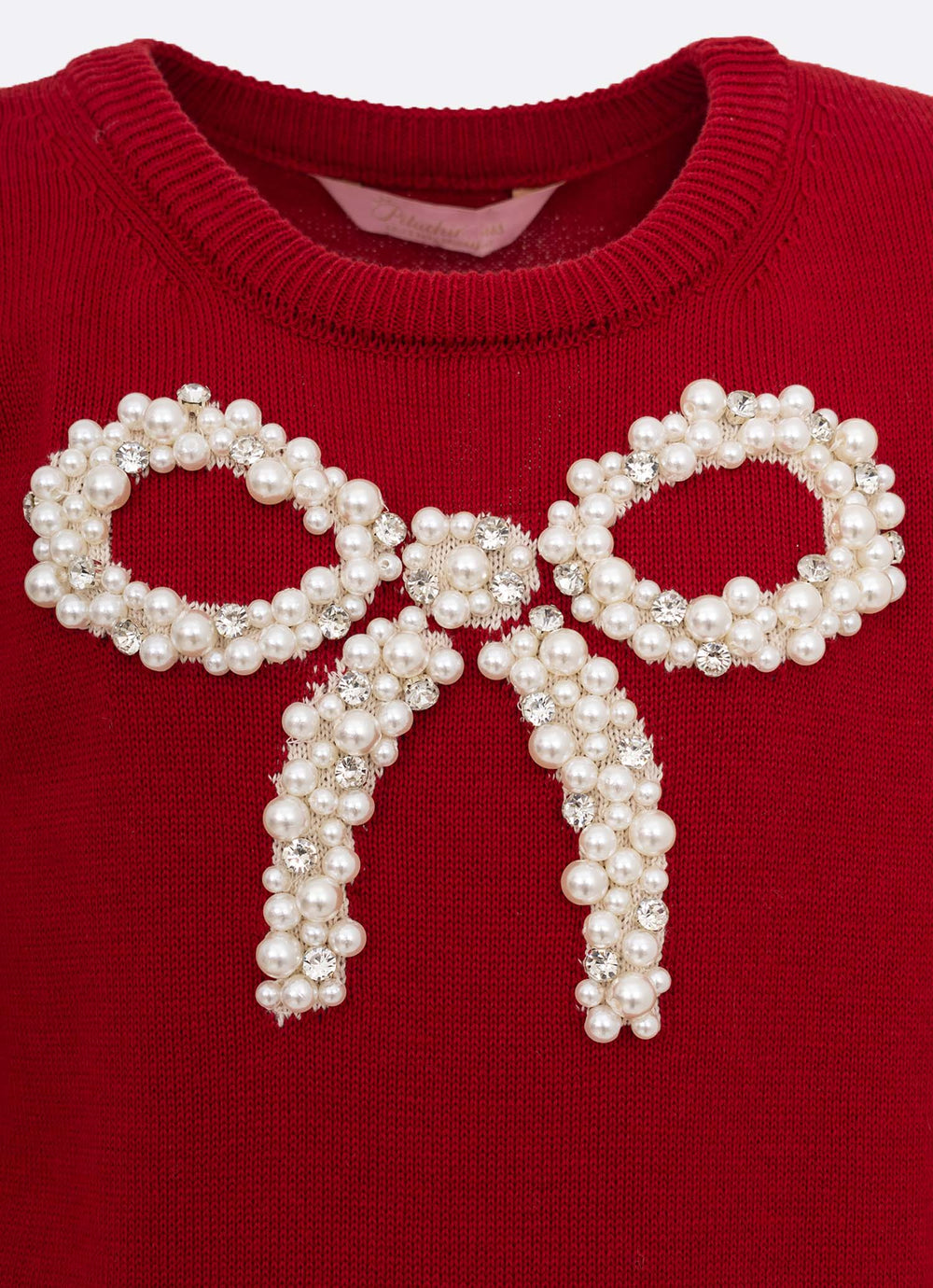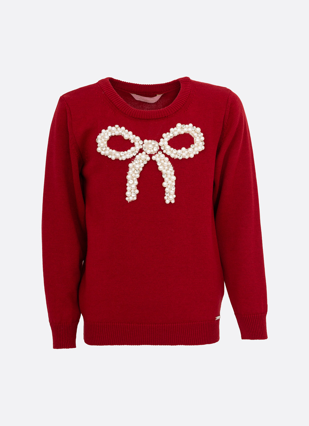 Blusa manga longa de tricot Pituchinhus. Gola redonda e acabamentos canelados. Detalhe frontal de laço com aplicação de bordados manuais de pérolas e caixilhos.