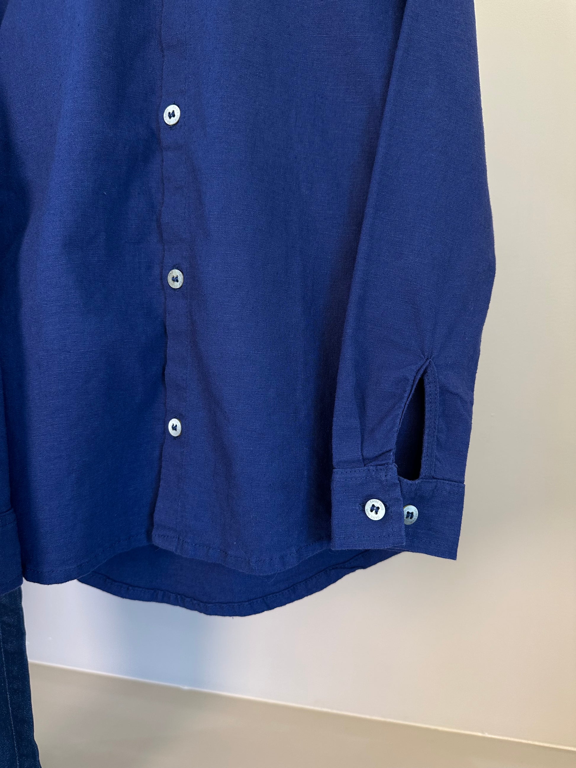 Este conjunto infantil apresenta uma camisa de linho azul marinho, que garante conforto e frescor durante o uso, combinada com calças sociais skinny de sarja bege, que oferecem durabilidade e um caimento elegante. A união desses materiais proporciona uma aparência sofisticada e prática, ideal para crianças que precisam de liberdade de movimento sem abrir mão do estilo. Perfeito para ocasiões que exigem um visual polido e confortável.