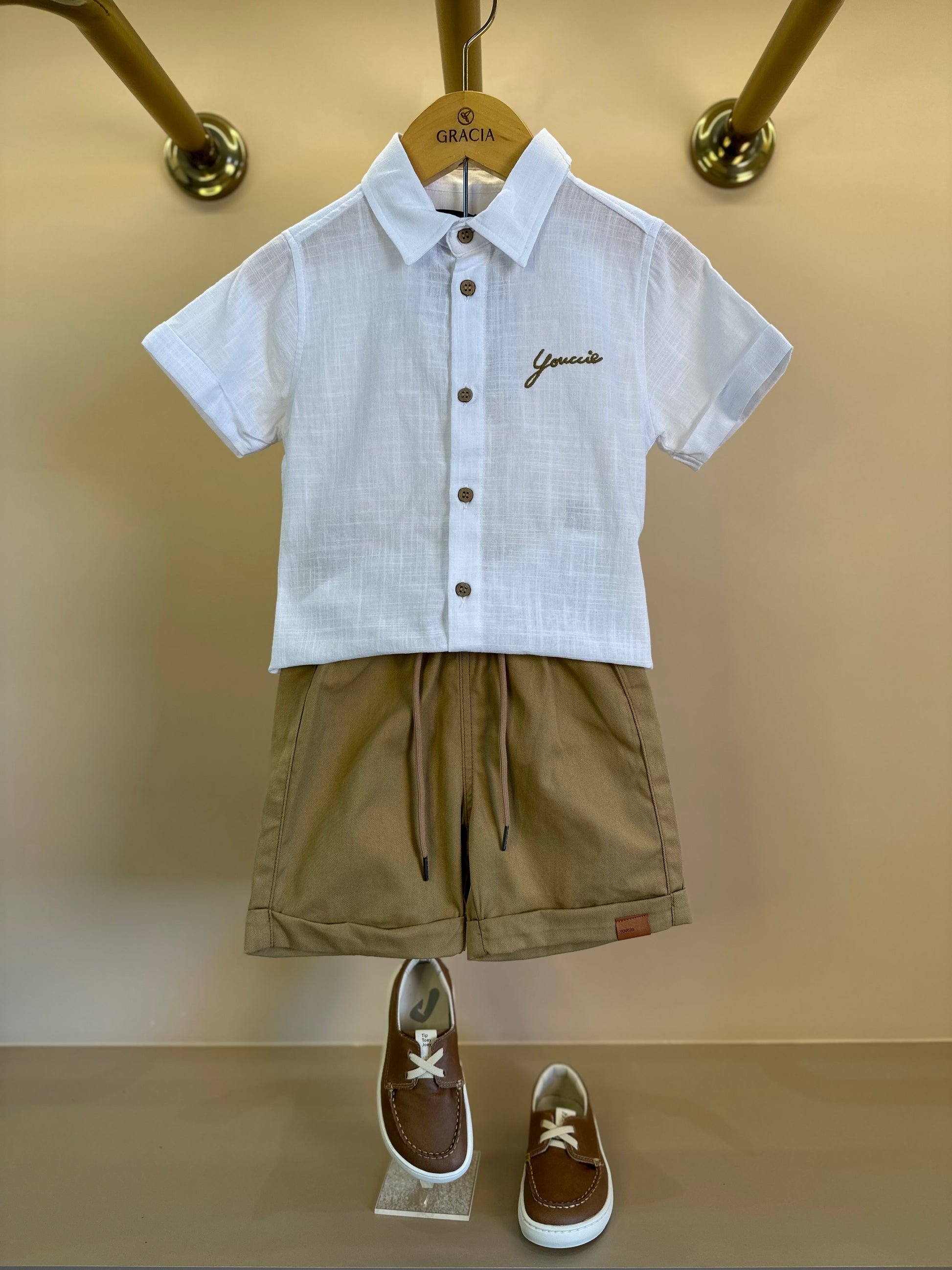 Conjunto Infantil Camisa Off White e Bermuda Caramelo - Youccie