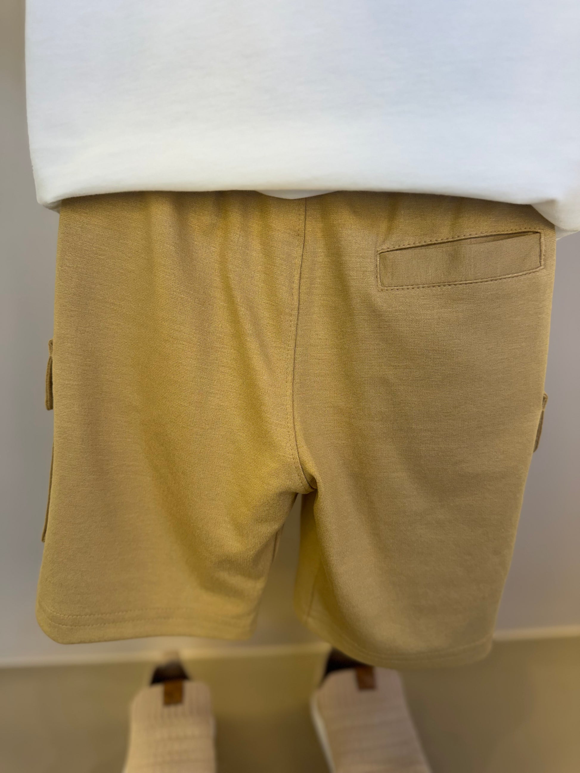 Conjunto Infantil Camiseta Algodão Teddy Natal MC e Bermuda Ponto Roma Bolsos Cargo Bege - Dame