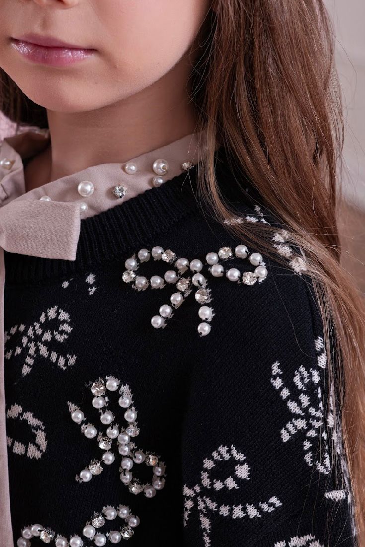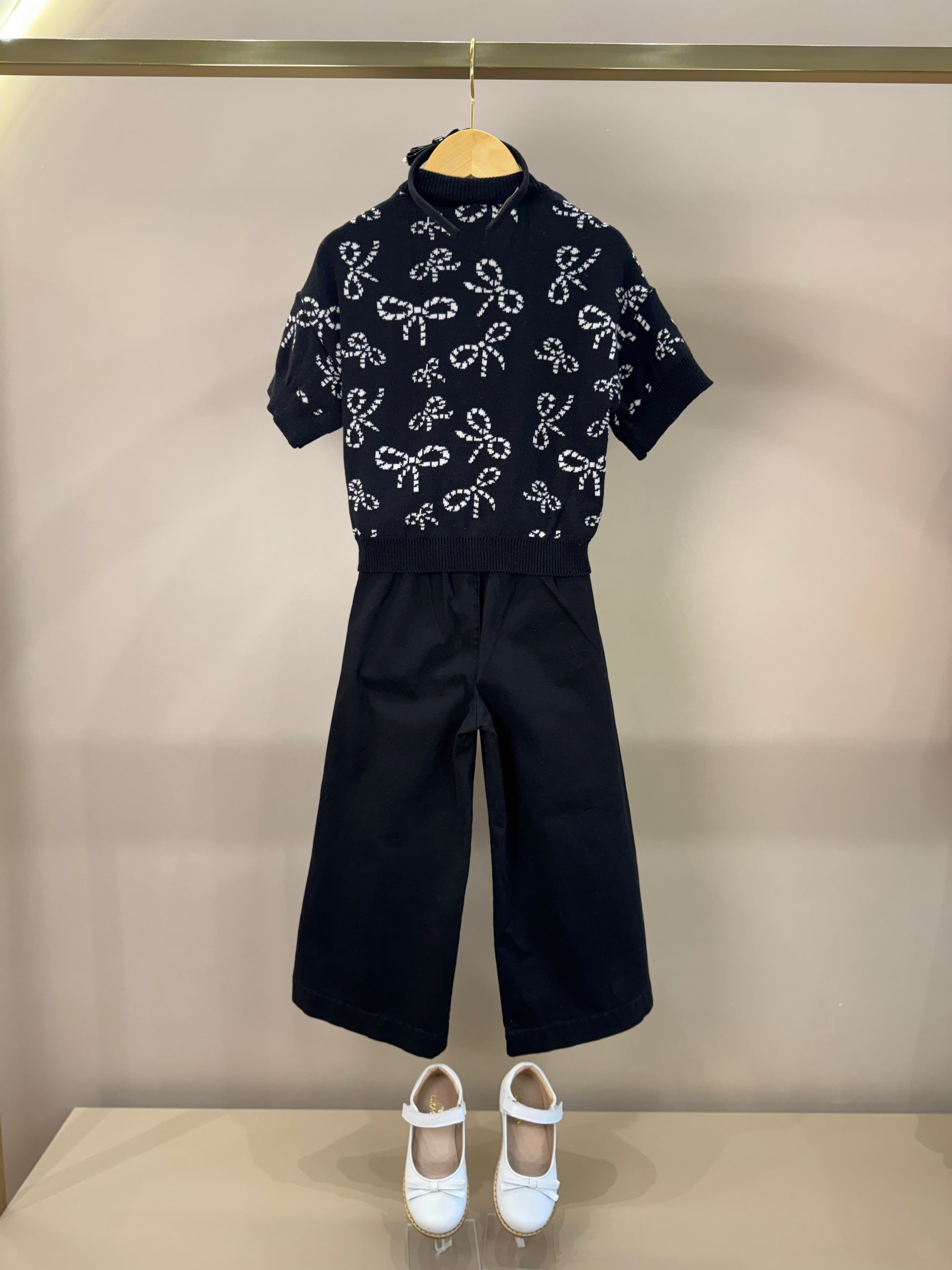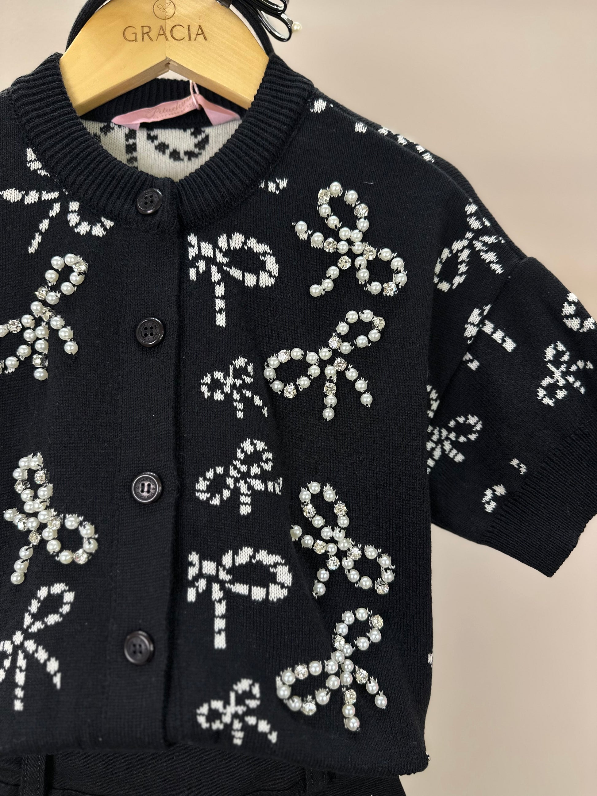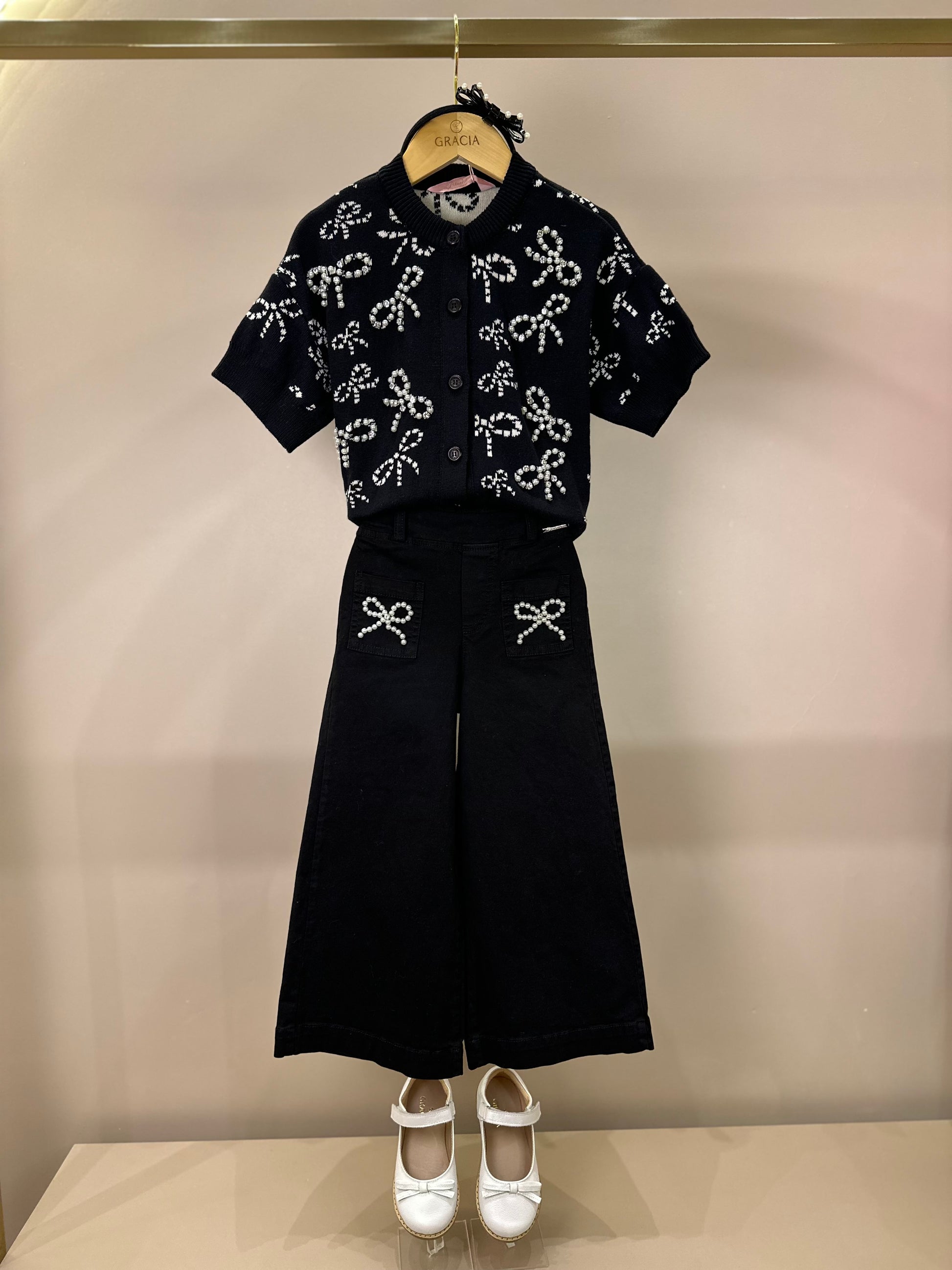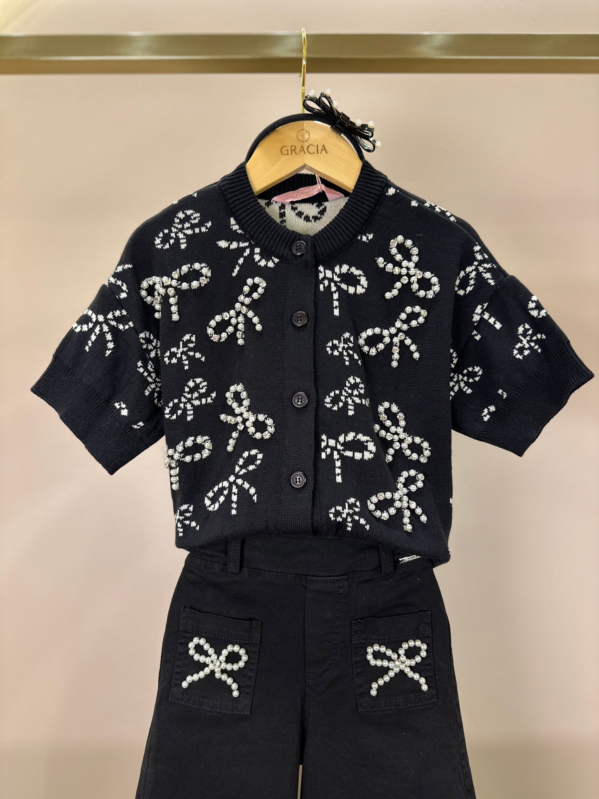 Conjunto Infantil Casaco Tricot Lacinhos Bordados Pérolas e Cristais e Calça Sarja Reta Laços Bordados Bolsos Preta - Pi