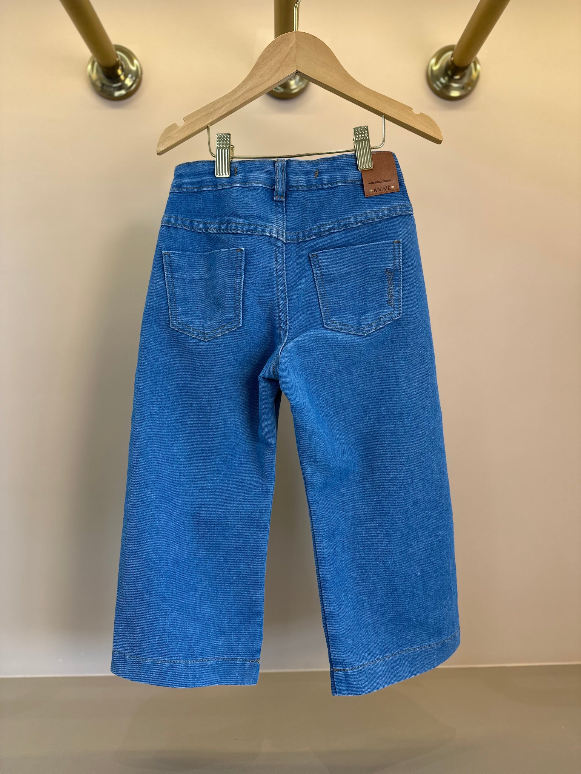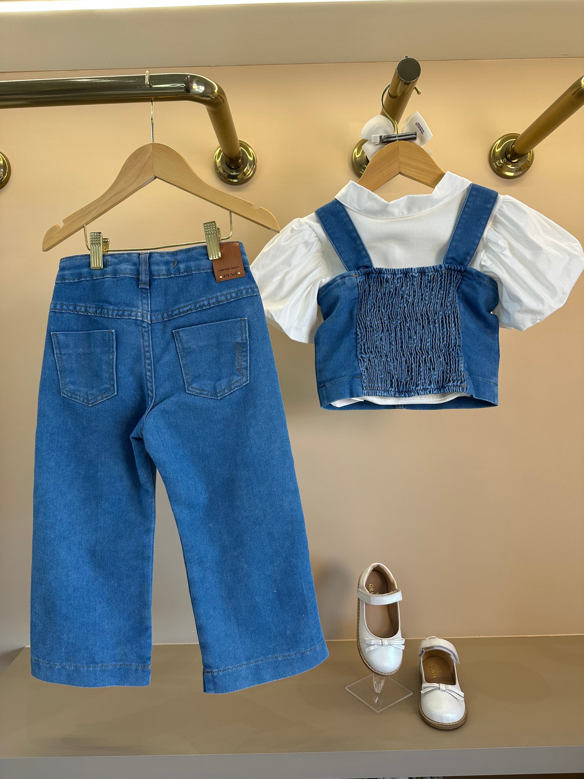 Conjunto Infantil Sobreposição Jeans, Blusa Manga Bufante e Calça Plissada - Animê
