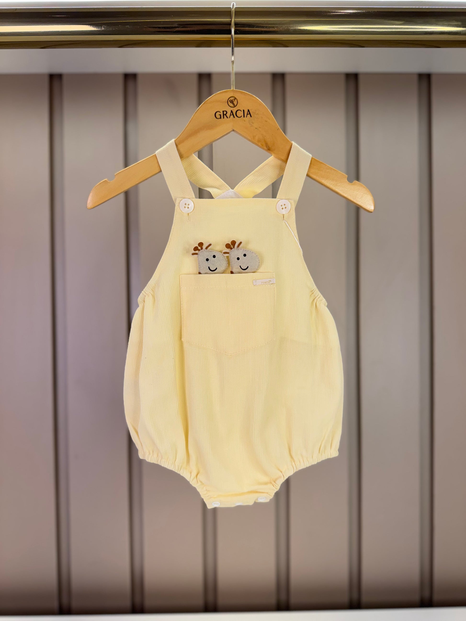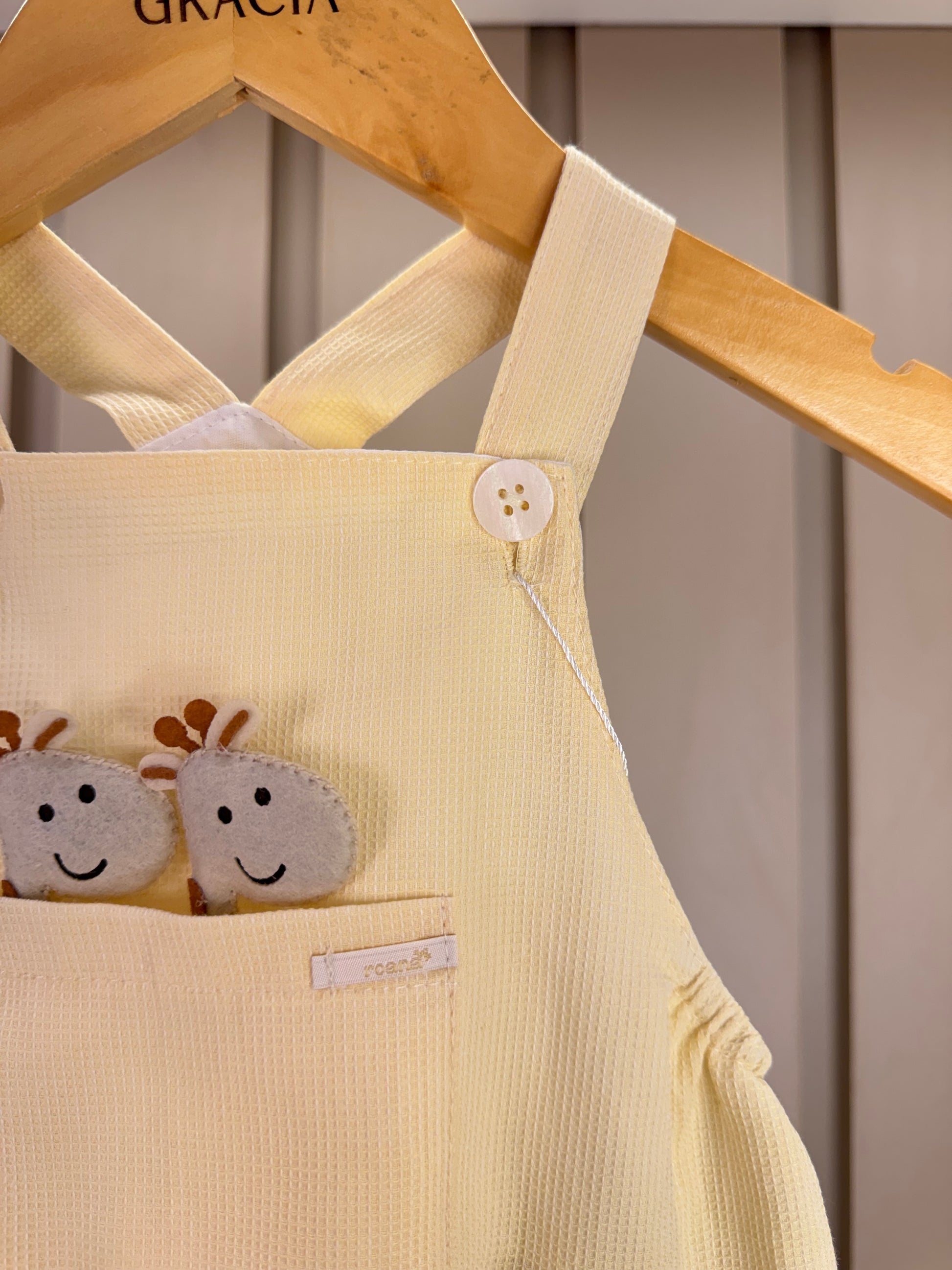 Jardineira em algodão premium com estampa exclusiva de girafa, ideal para revelação de gênero ou celebrações especiais. O design Roana combina conforto e estilo, apresentando detalhes cuidadosamente pensados para bebês. Tecido respirável e macio ao toque garante liberdade de movimento durante o dia. Perfeita para fotosessões, eventos ou uso diário, esta peça versátil complementa qualquer guarda-roupa infantil com elegância e sofisticação.