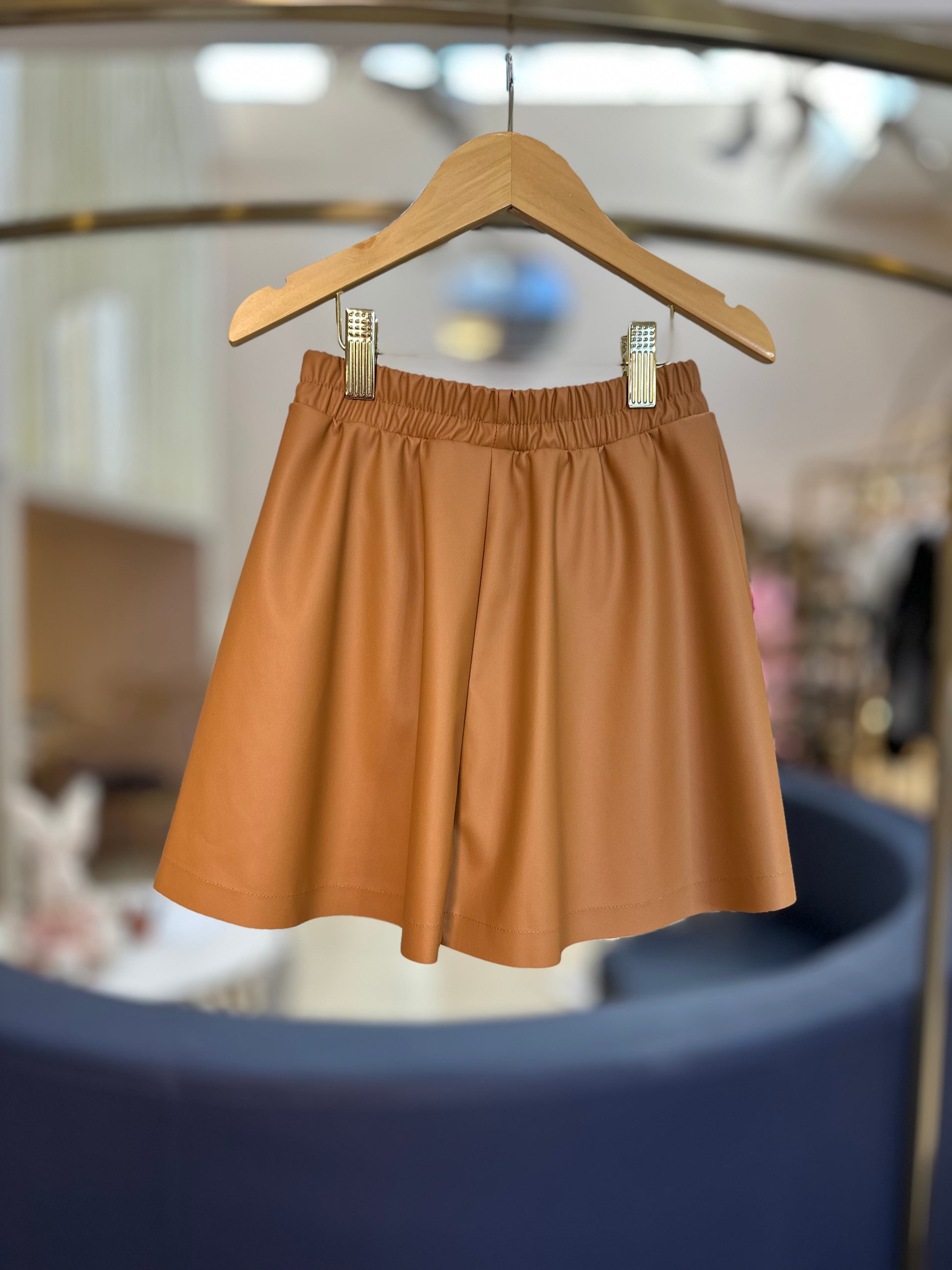 Saia camel em material sintético com textura sofisticada e elástico na cintura, garantindo ajuste perfeito e conforto. Um item versátil para compor looks modernos e elegantes. Ref.: J6258 *Nota: Acompanha short de malha.