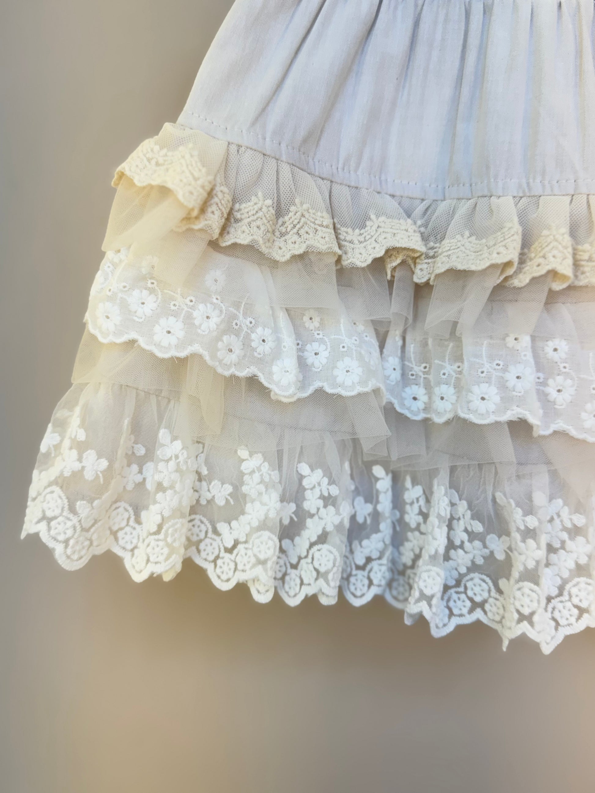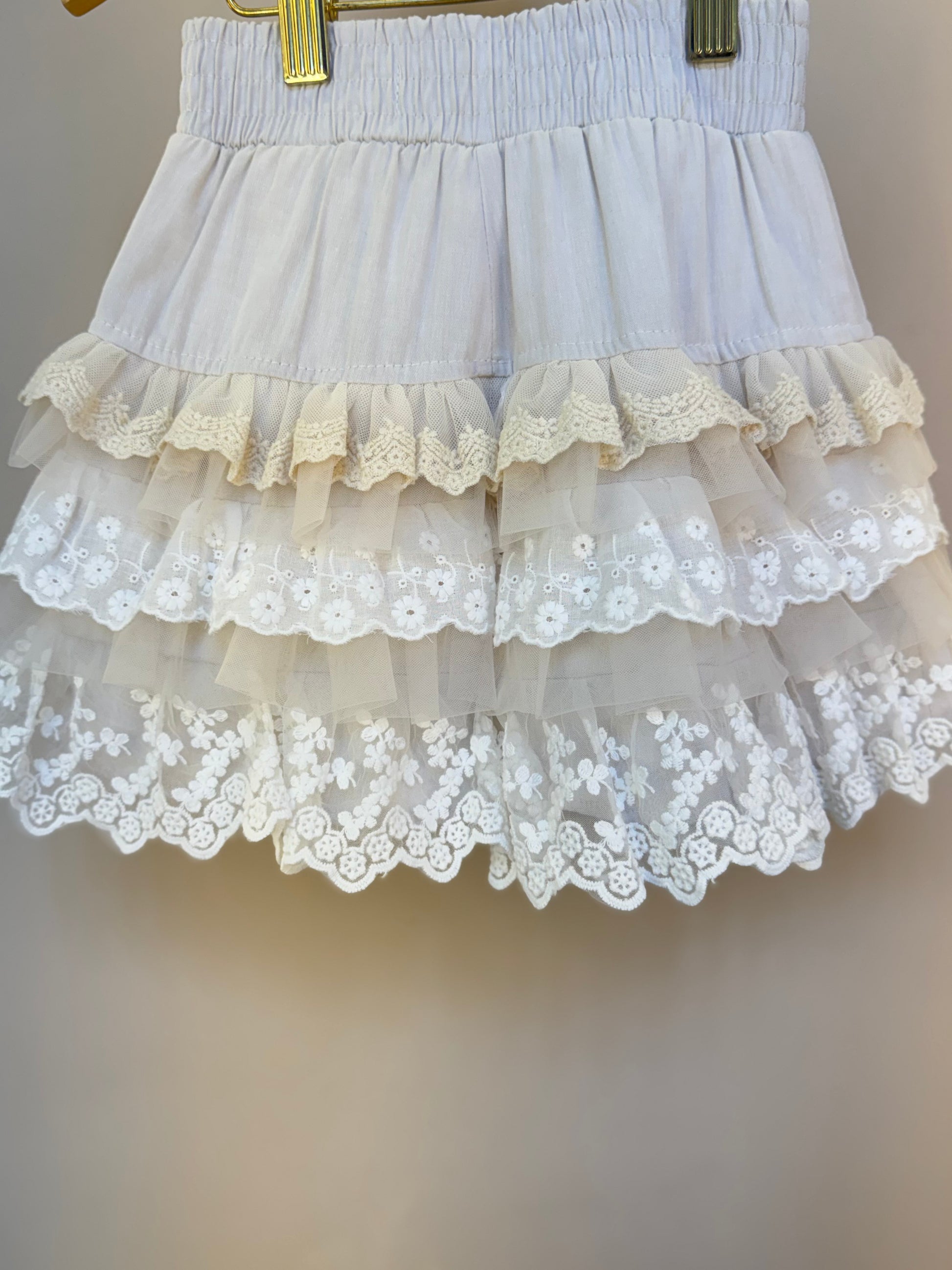 Saia short em algodão com cós elástico, babados sobrepostos e rendinha nas barras. Confortável, fofa e perfeita para looks delicados e autênticos.