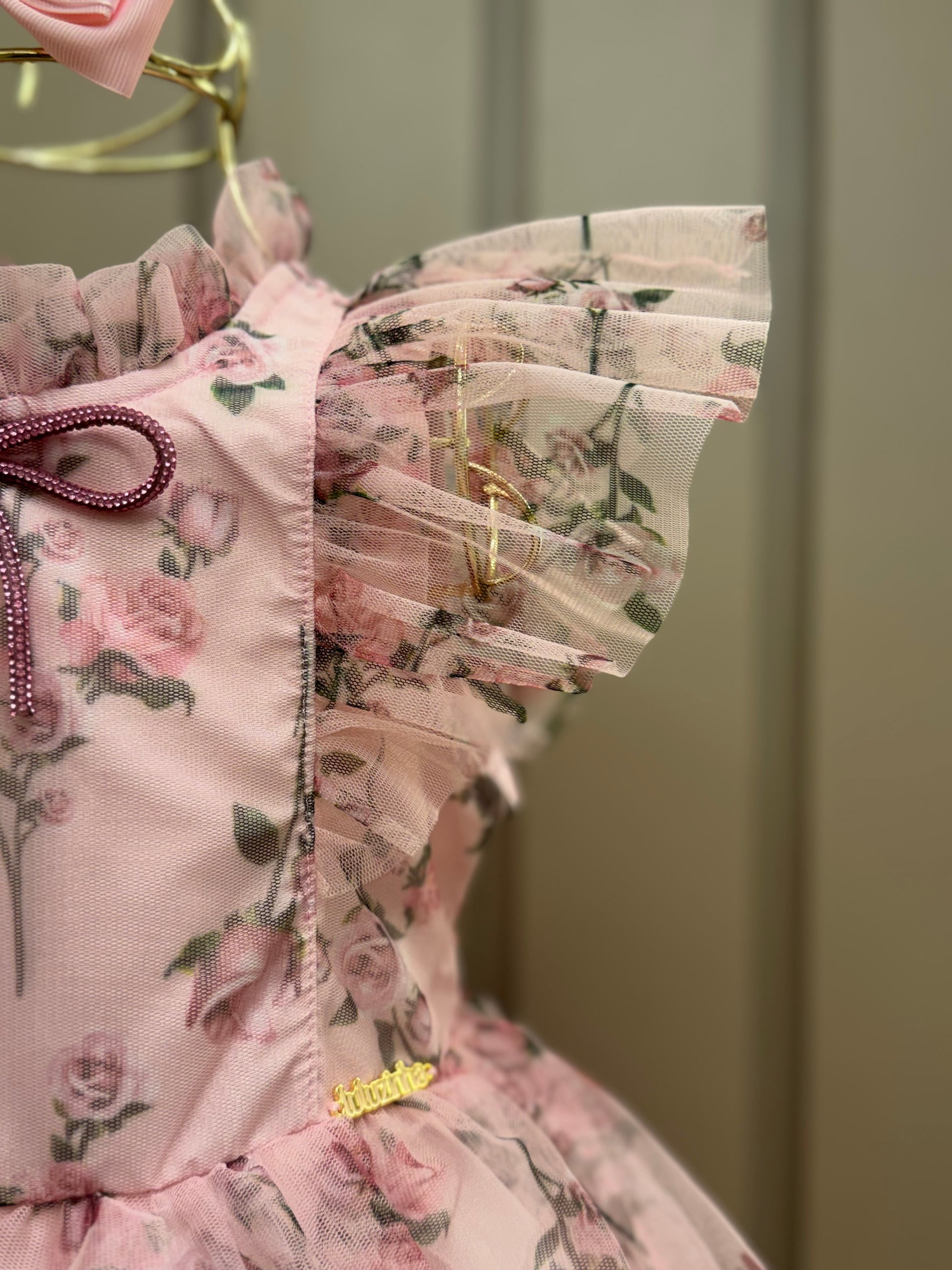 Vestido Infantil Festa Princesa Tule Floral Rodado Rosa - Luluzinha