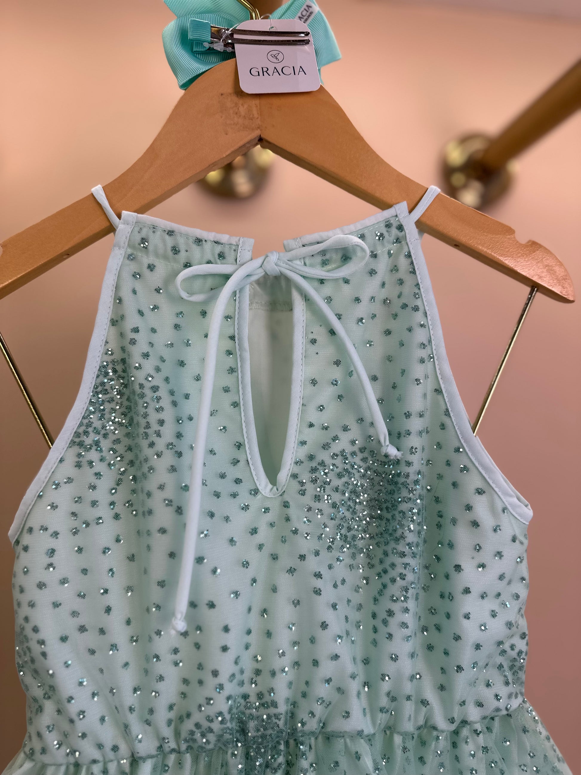 Este vestido infantil combina delicadeza e brilho, apresentando uma saia rodada em tule com pequenas florzinhas e detalhes em glitter que encantam e garantem conforto para as ocasiões especiais. Ideal para meninas que desejam um visual elegante e leve, que permite liberdade de movimento sem abrir mão do charme. Perfeito para festas, passeios e momentos que pedem um toque de magia no guarda-roupa infantil.