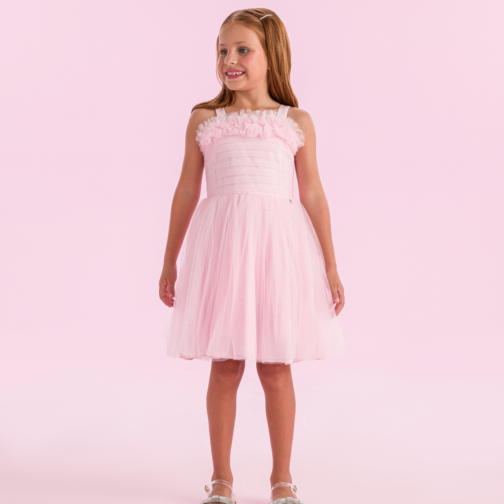 Vestido Infantil Tule com Brilho Tomas e Frufru Rosa Claro - Petit Cherie