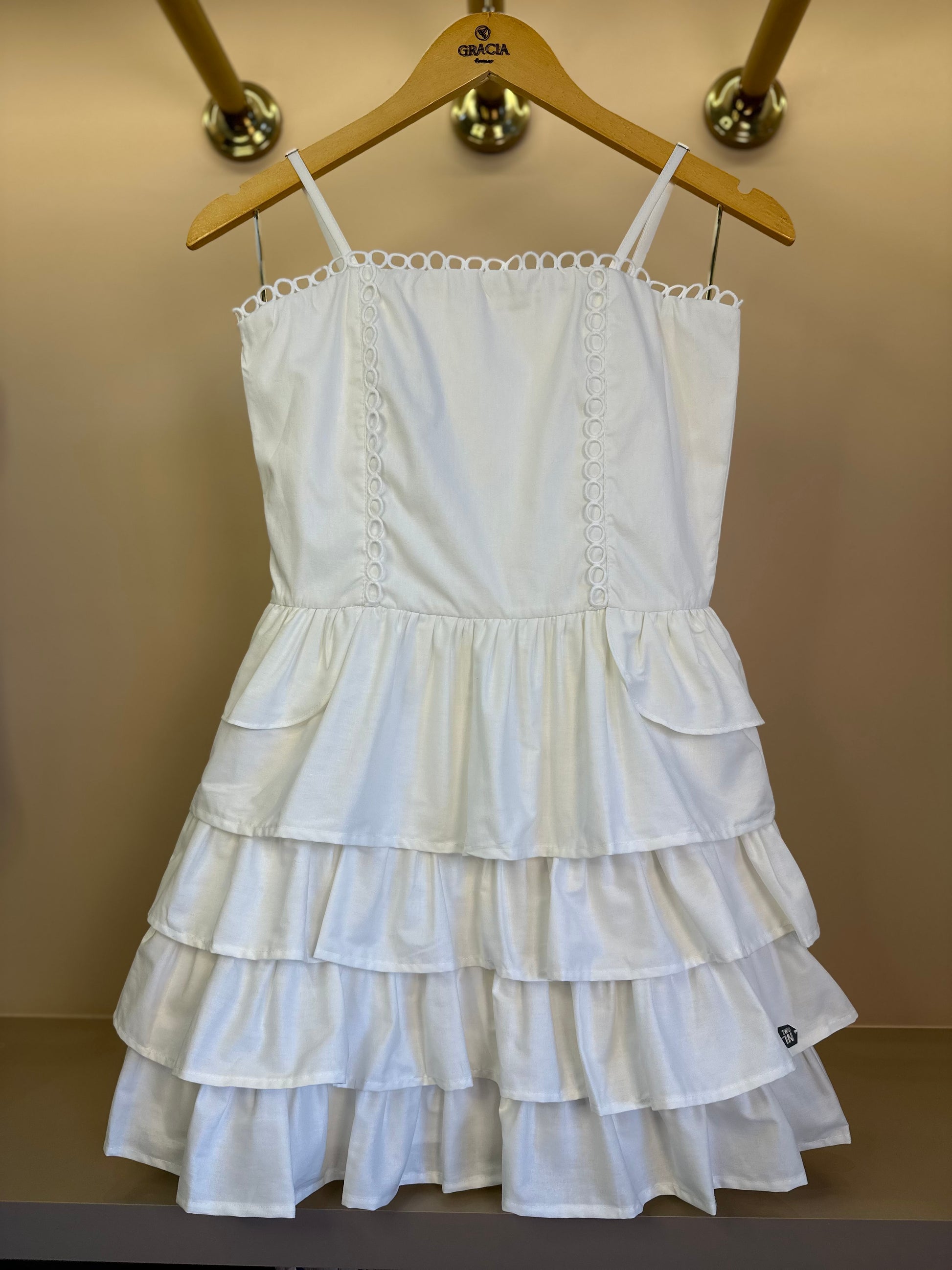 Este vestido teen da Two In em tom off white destaca-se pelas camadas delicadas de babados, que conferem movimento e sofisticação à peça. Ideal para ocasiões especiais, seu design proporciona conforto e estilo, valorizando a silhueta jovem com um toque elegante e contemporâneo. A escolha perfeita para meninas que buscam uma combinação harmoniosa entre delicadeza e modernidade.