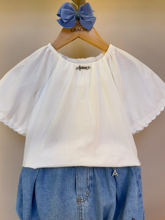 Conjunto Infantil Blusa Mangas Amplas e Recorte Costas e Saia Jeans Elástico Style Minnie - Animê